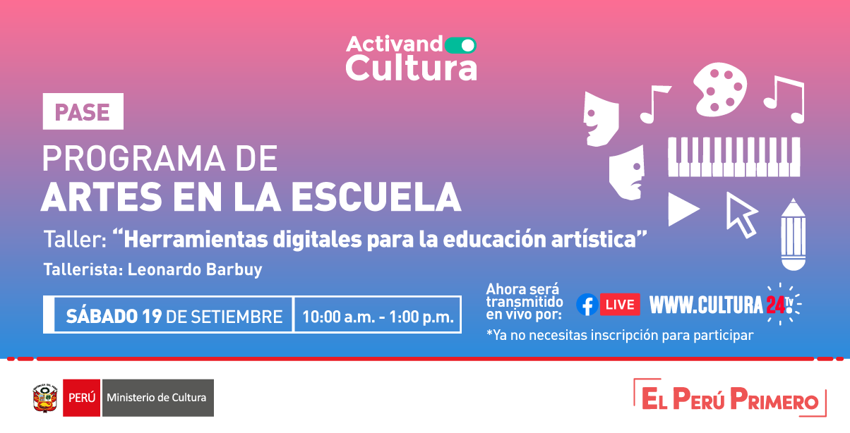 El Ministerio de Cultura, a través de la Dirección de Artes, organiza un nuevo taller en el marco del Programa de Artes en la Escuela – PASE el día sábado 19 de septiembre de 2020, de 10:00 a.m. a 1:00 p.m. vía zoom, previa inscripción.