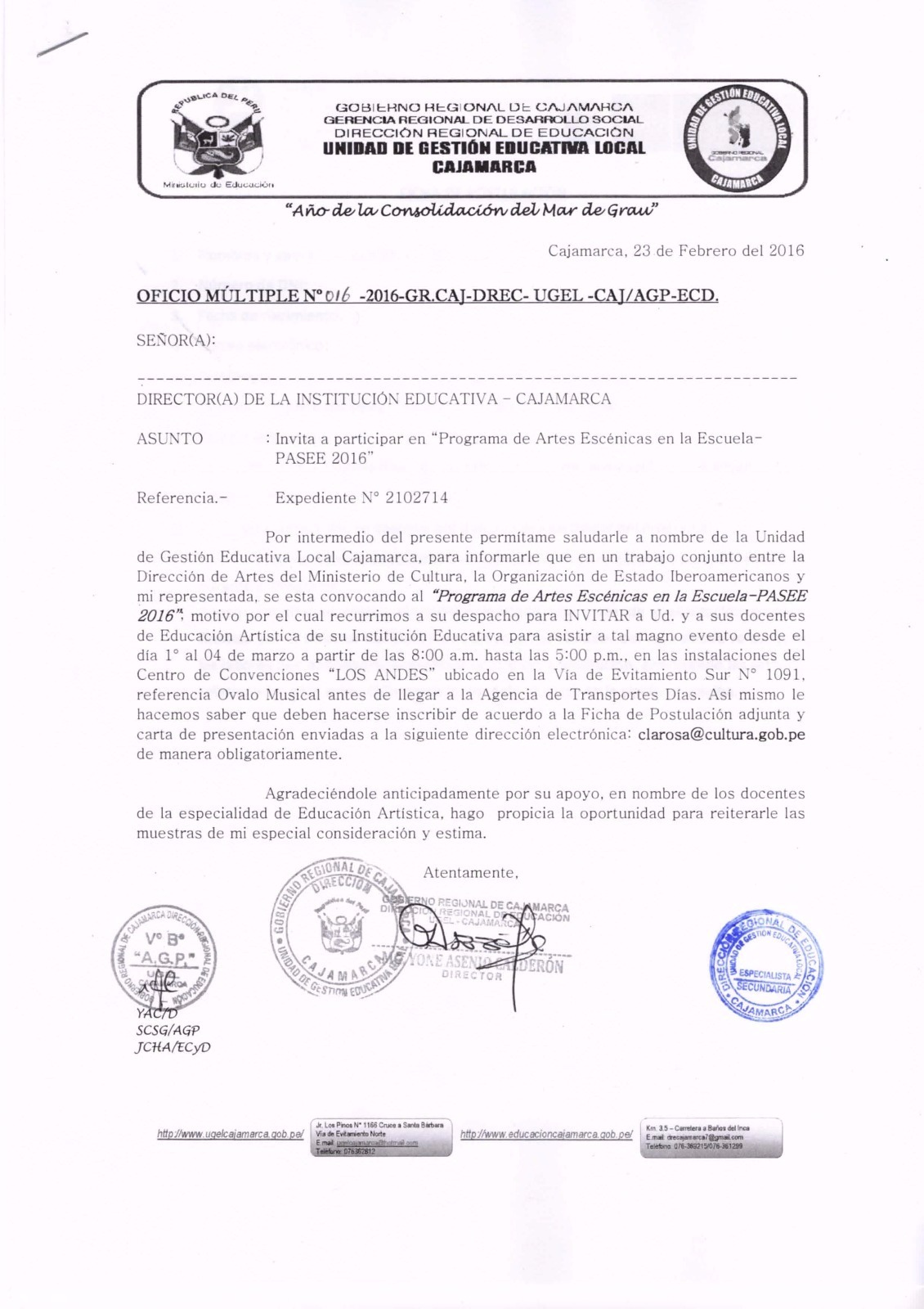 La Dirección de Artes del Ministerio de Cultura, la Organización de Estados Iberoamericanos – OEI, y la UGEL Cajamarca, lanzan la convocatoria al “Programa de Artes Escénicas en la Escuela 2016”, donde docentes de inicial, primaria y secundaria, podrán acceder a capacitaciones gratuitas sobre el uso e importancia de las artes escénicas en las escuelas para la formación de niños, niñas y adolescentes.