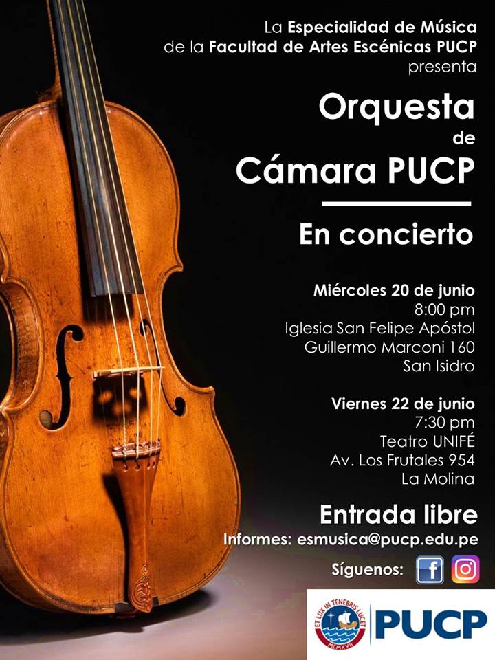 La Orquesta de Cámara de la Especialidad de Música de la PUCP, dirigida por la reconocida violinista Elmira Pouroundjan, y compuesta por estudiantes de la sección clásica de la Especialidad de Música de la Facultad de Artes Escénicas ofrecerá dos conciertos los días miércoles 20 de junio a las 8:00p.m. en la Iglesia San Felipe Apóstol (Calle Guillermo Marconi 160 – San Isidro) y el viernes 22 de junio a las 7:30pm en el Teatro UNIFÉ (Av. Los Frutales 954 – La Molina). En ambas ocasiones participará también la destacada soprano Jacqueline Terry, profesora también de la mencionada casa de estudios.  El ingreso a ambos concierto es libre.