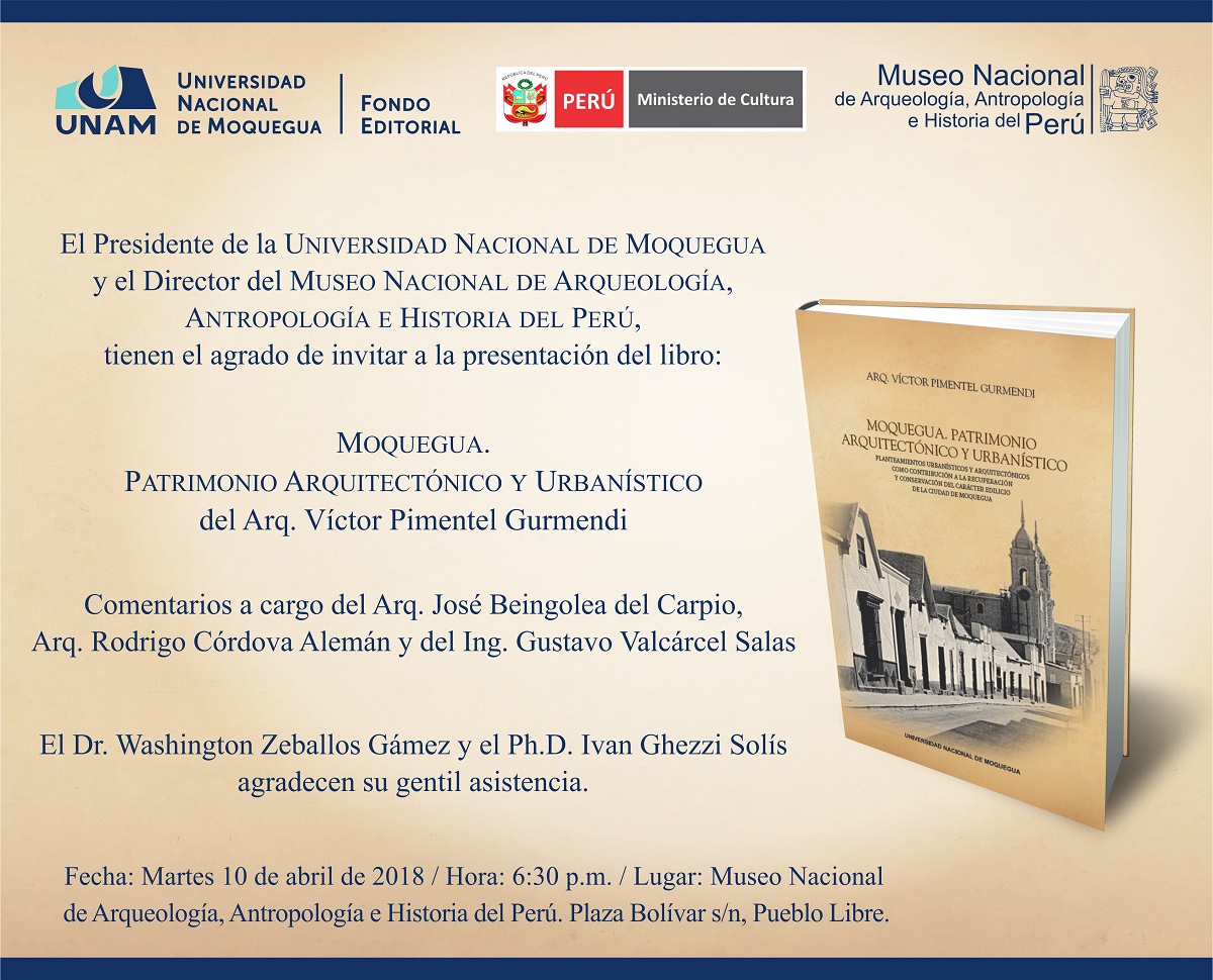 El Museo Nacional de Arqueología, Antropología e Historia del Perú será escenario de la presentación del libro Moquegua. Patrimonio Arquitectónico y Urbanístico del Arquitecto Víctor Pimentel Gurmendi.
