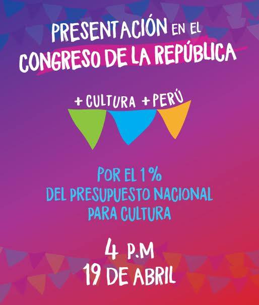 Con mucho entusiasmo, invitamos a la presentación de la campaña ciudadana “Más Cultura, Más Perú” a realizarse en el Congreso de la República el miércoles 19 de abril de 4:00 a 6:00 p.m. la cual tendrá como invitado al actual Ministro de Cultura, señor Salvador Del Solar, y de congresistas que están impulsando iniciativas legislativas en cultura.