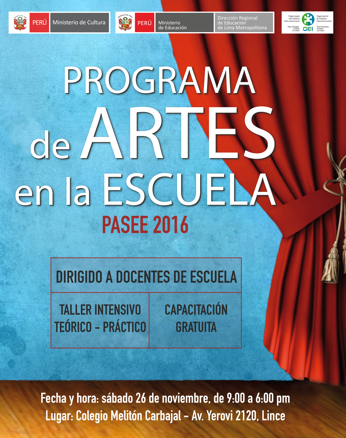 El Programa de Artes en la Escuela – PASEE 2016, es un programa de fortalecimiento de capacidades dirigido a docentes de inicial, primaria y secundaria que, mediante un abordaje teórico, vivencial y práctico, incorporarán conocimientos, técnicas y actitudes necesarias para contribuir, desde las artes y la cultura, al ejercicio de la ciudadanía intercultural en la escuela.