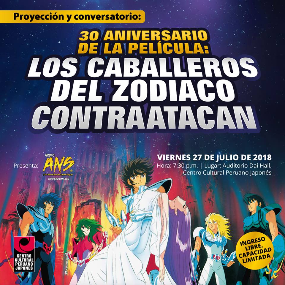 En el marco del 30 Aniversario del estreno de la película de Los caballeros del Zodiaco, se realizará este homenaje que contará con una charla previa, proyección de la película y exposición de mercadería nunca antes vista relacionada con el largometraje. El homenaje es organizado por el Grupo Athena No Seintos: Tu Fan Club de Saint Seya y el Centro Cultural Peruano Japonés.