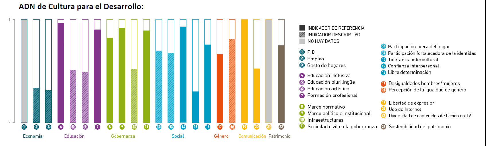 - ADN de la Cultura comprende 22 indicadores que atraviesan 7 dimensiones: economía, educación, participación social, gobernanza, comunicación, equidad de género y patrimonio.