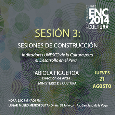 En el marco del 4to Encuentro Nacional de Cultura 2014, el Ministerio de Cultura junto a la oficina de UNESCO en Lima participarán presentando una mesa de trabajo y de reflexión sobre el proceso de implementación del proyecto Indicadores de la Cultura para el Desarrollo en el Perú”. Luz Fabiola Figueroa Cárdenas, Directora de la Dirección de Artes y Magali Robalino, representante de UNESCO en Perú presentarán la referida mesa en las denominadas "Sesiones de construcción" del día jueves 21 de agosto a las 17:00 horas.
