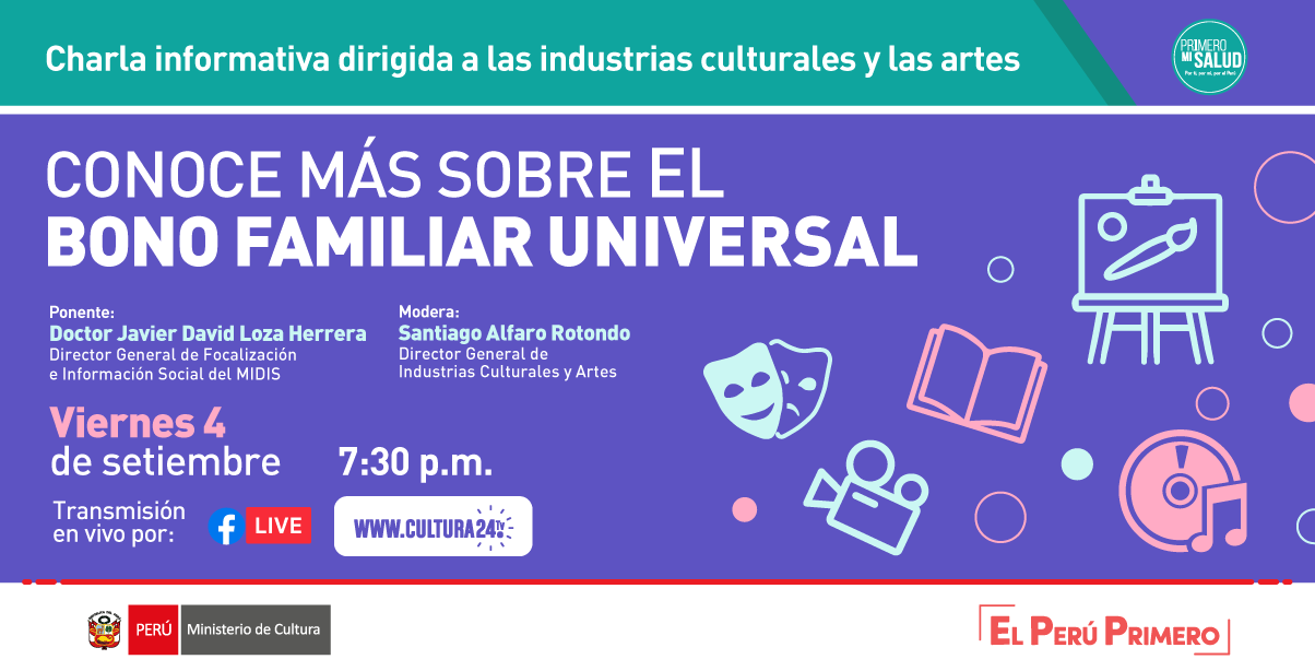 #Atención al sector de las industrias culturales y artes. El Ministerio de Desarrollo e Inclusión Social del Perú nos informará sobre el Bono Universal Familiar a través de una charla informativa.