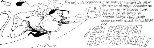 Este primer comic es una sátira del género de superhéroes, aclara Raschid, generada a partir de una recreación del personaje de Superman, cuyo tema principal es la sexualidad, tópico prohibido en dicho género. De esta manera, el superpoder de Sperman se centra en la capacidad de fecundar a las mujeres para impedir el fin de la raza humana.