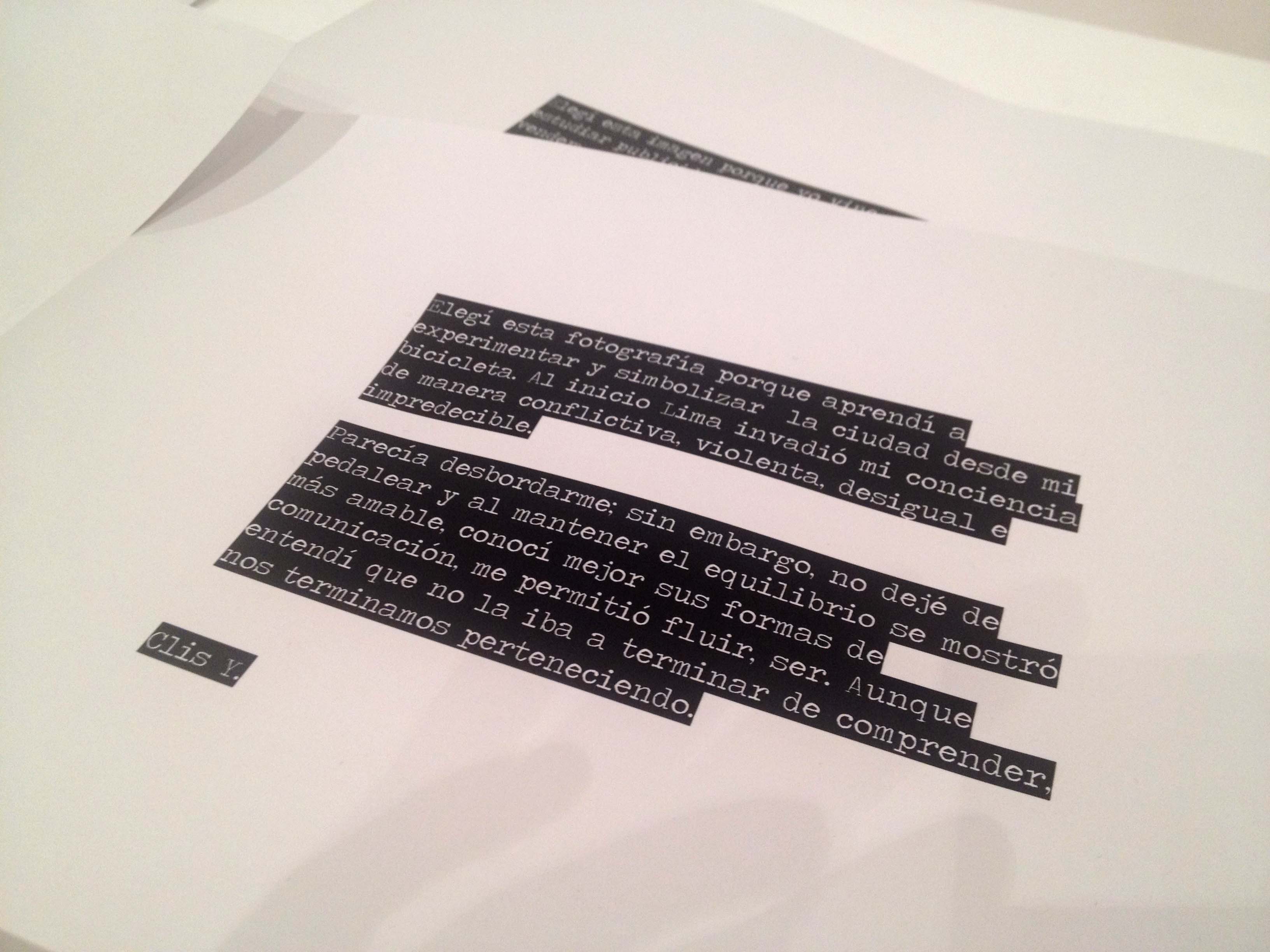 Los sujetos son invitados a fotografiar y a verbalizar hablar sobre sus contextos y motivaciones. Leyendo los fragmentos que acompañan a las fotografías el espectador puede profundizar en los contextos y particularidades que motivaron al autor la toma fotográfica, sus puntos de anclaje en el proceso de establecerse en Lima y sus presencias y ausencias.