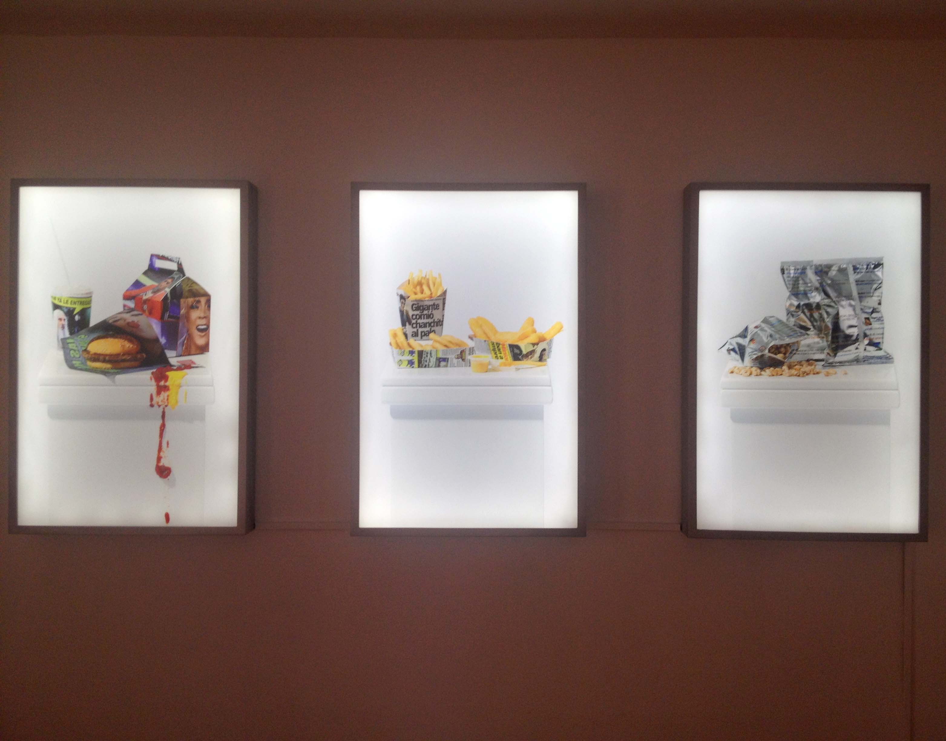 La propuesta ‘Consumo basura’ de Eléspuru es un ejercicio que va más allá de lo meramente fotográfico para rozar la instalación. Ella misma toma parte en el proceso de creación de la obra para después fotografiarla y presentarla expuesta en cajas de luz con una marcada estética pop. En las imágenes se pueden ver tres bodegones de comida rápida cuyos envoltorios están hechos a base de portadas de revistas del corazón peruanas y periódicos sensacionalistas. Analogía que pretende así denunciar el consumo sin criterio y masivo de ciertos medios de comunicación.