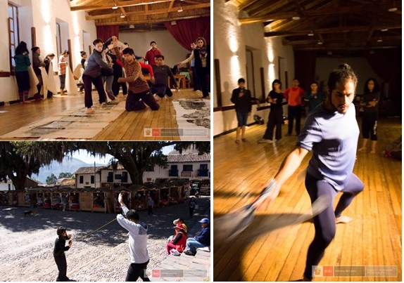 Lejos de ser pasivo, el medio ambiente entra en una transacción con los humanos, una especie de rapto que va poco a poco secuestrando nuestra atención y convocando los sentidos a un estado de prontitud para responder a la infinidad de estímulos. Así cada artista-coreógrafo sintoniza con su ambiente de modo particular y colectivo al mismo tiempo. Más tarde les pedimos revisitar estas memorias en sus múltiples niveles (la arquitectura de Andahuaylillas, la comunidad, los visitantes, la imponente iglesia, su accesibilidad, los olores, texturas, perros, paredes, detalles etc.).