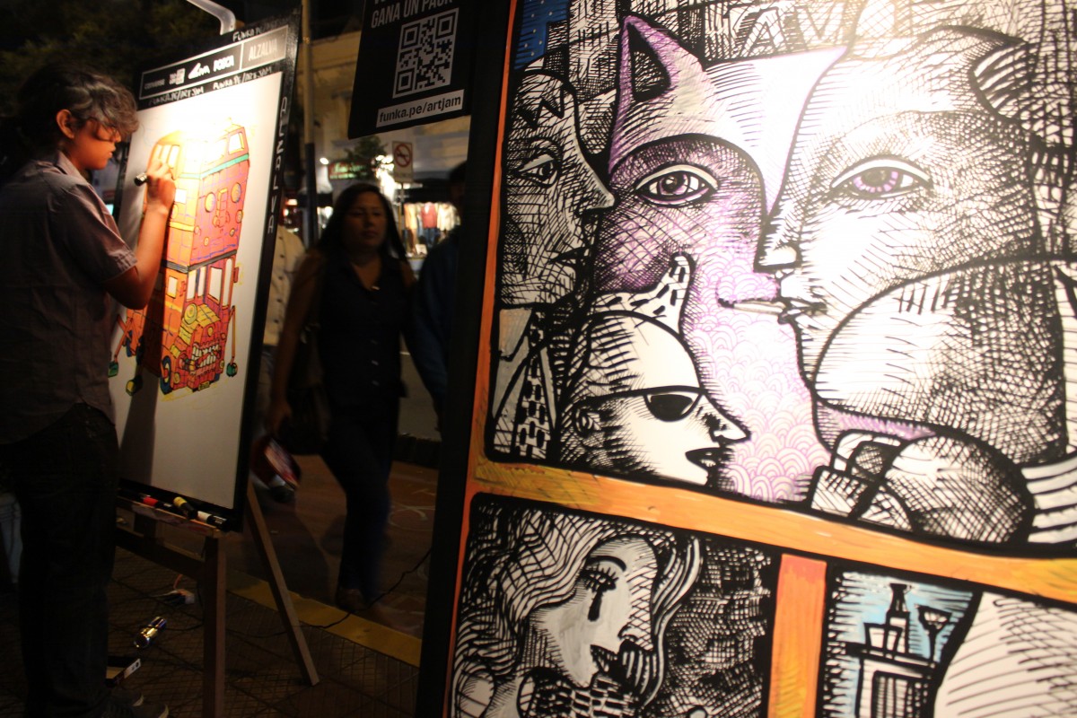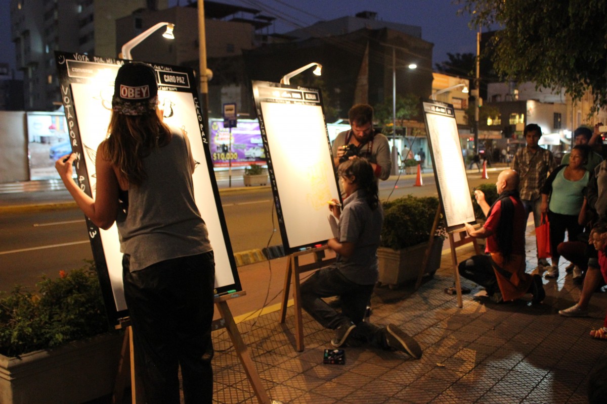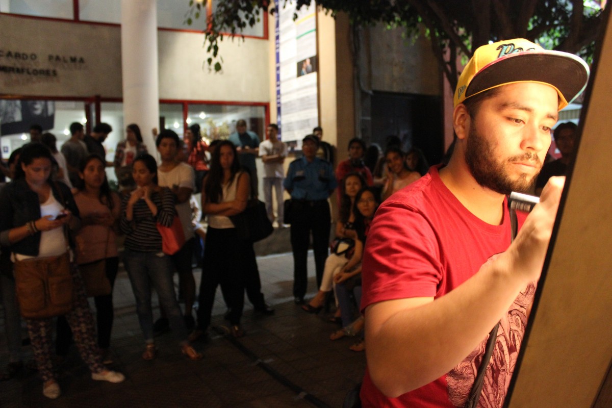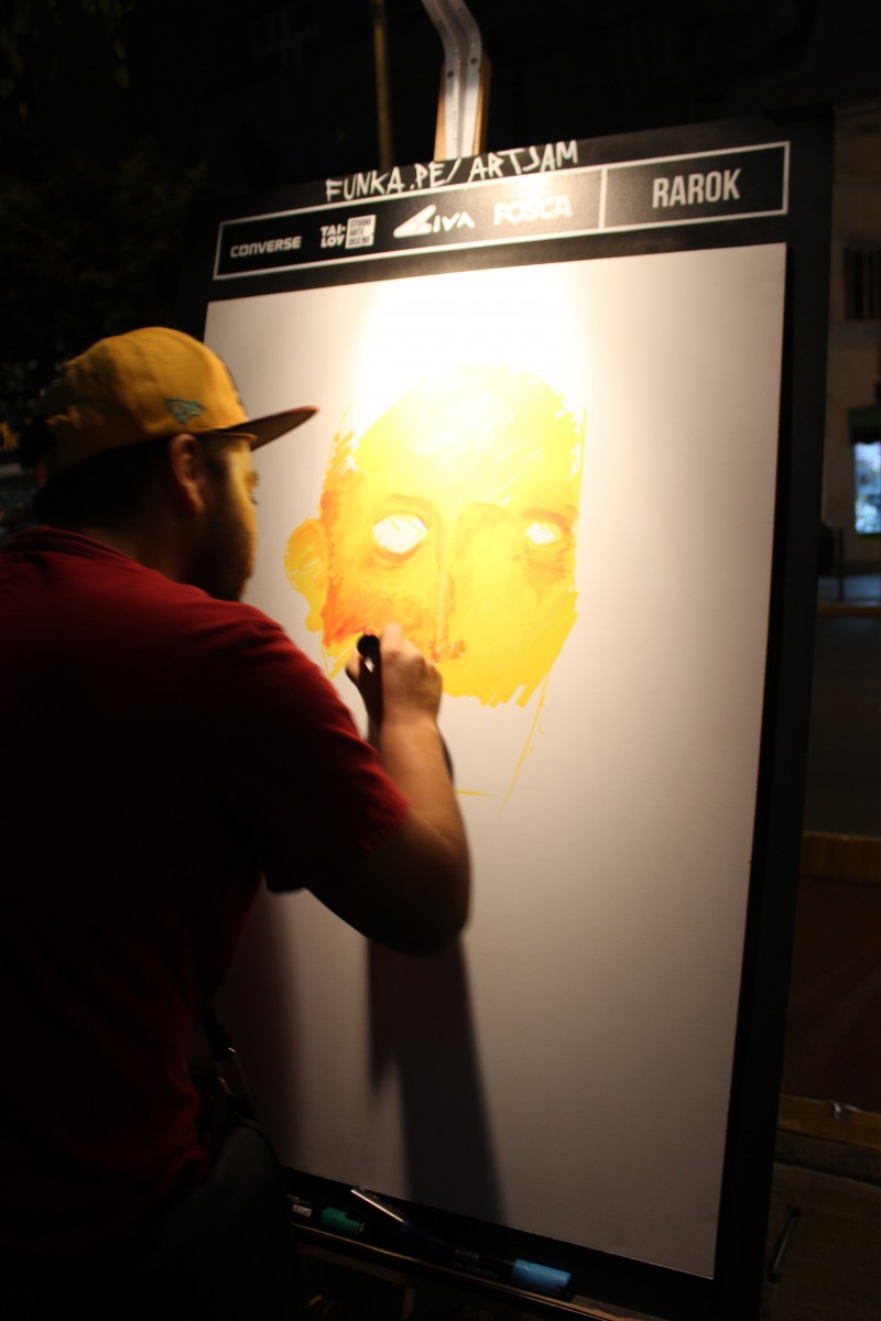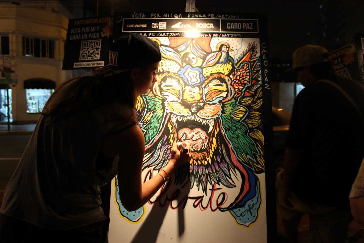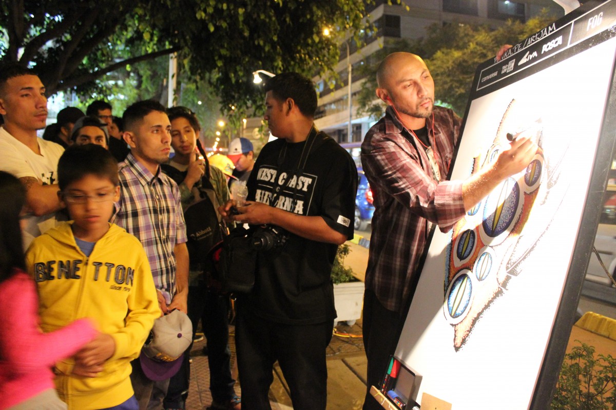 At 5 on Friday, Abril 17, onlookers watched as the sidewalk of outside of CC Ricardo Palma transformed into an art studio. Usually a private space, six urban artists invited all of Lima into their artistic processes. Of course, these urban artists are more accustomed to the street than your average painter, their canvases being construction walls late at night. Art Jam, however, put a spotlight on these stelth artists in order to celebrate them. Friends, family, art fiends, and curious foreigners all gathered around to watch the spectacle take place in front of them.