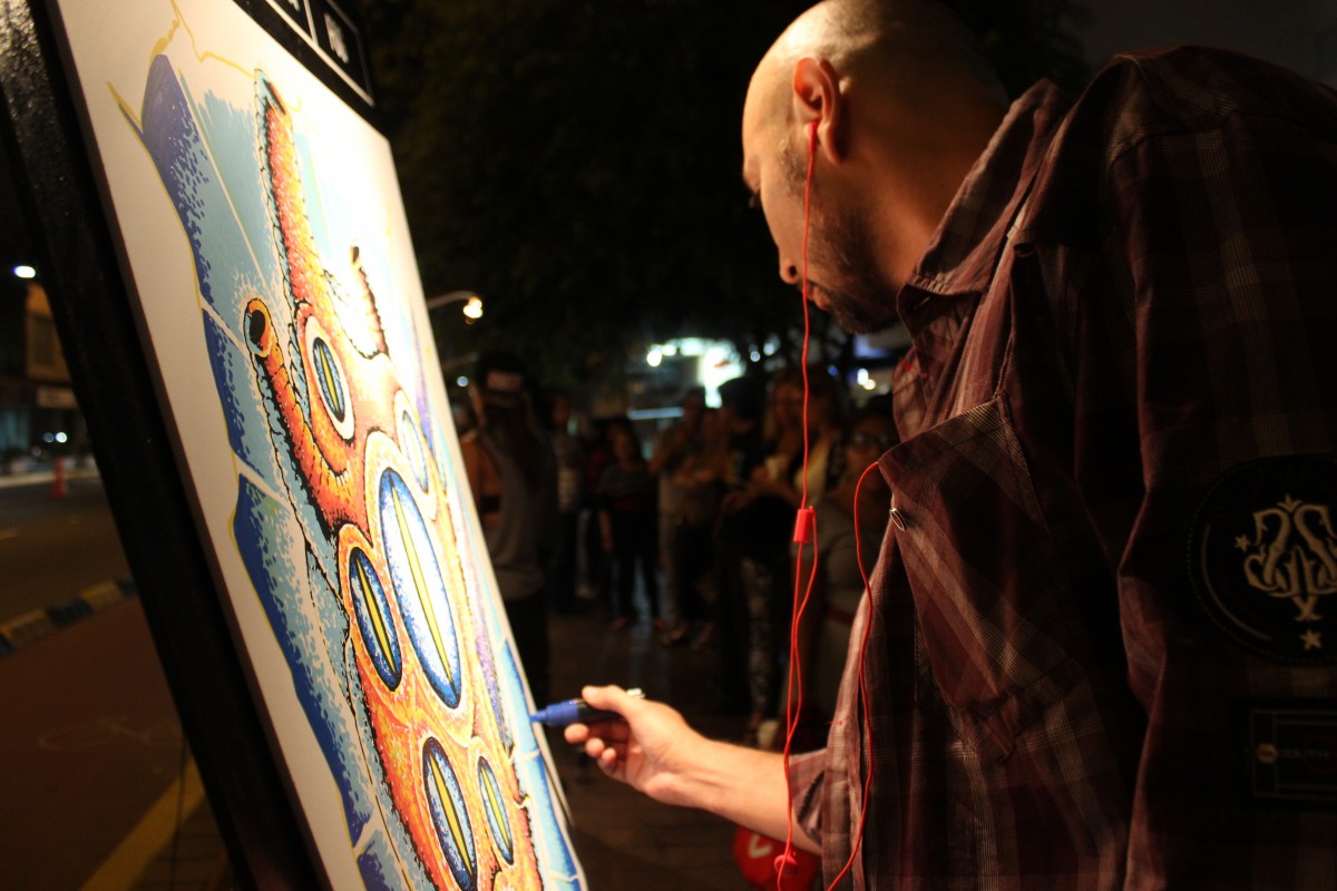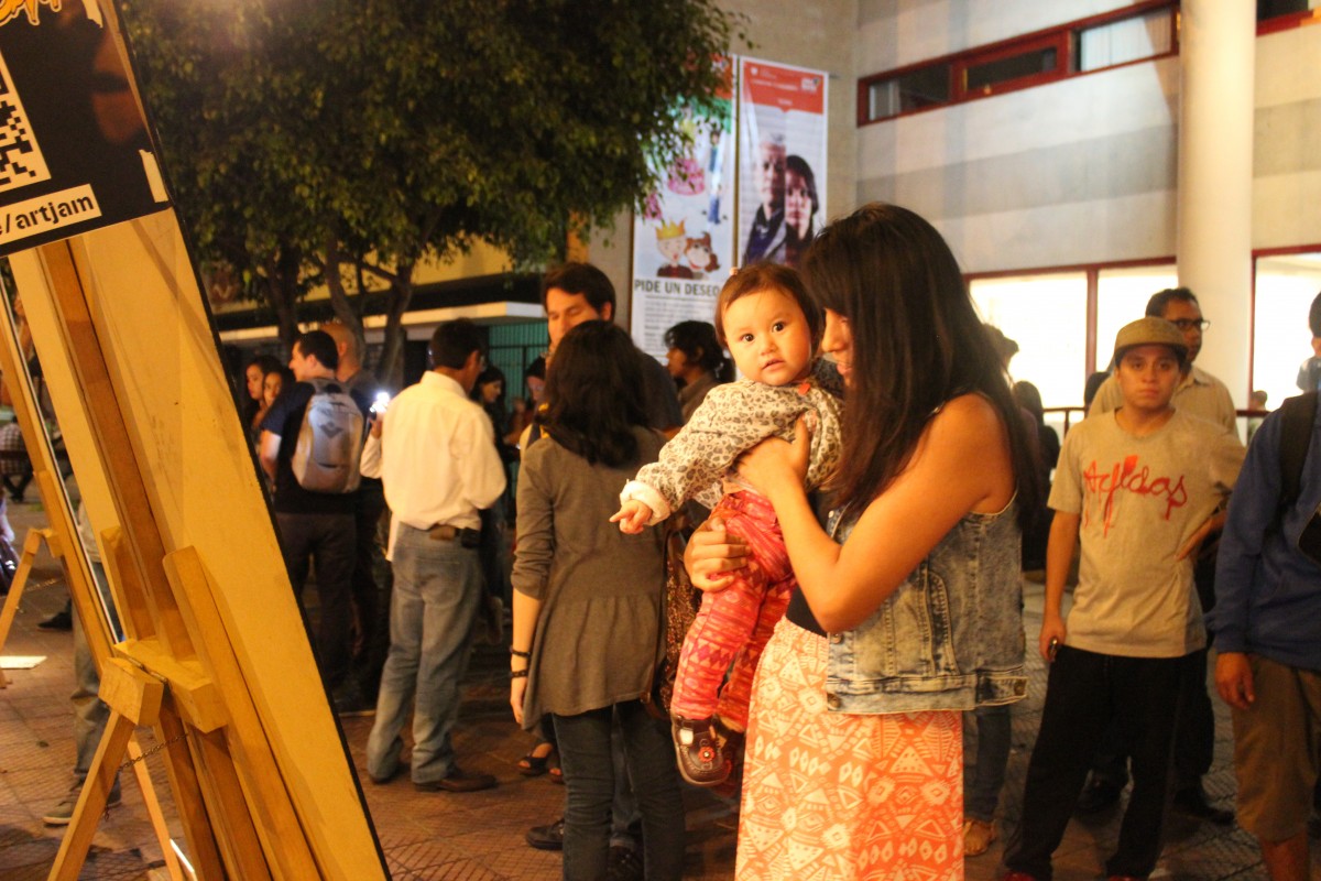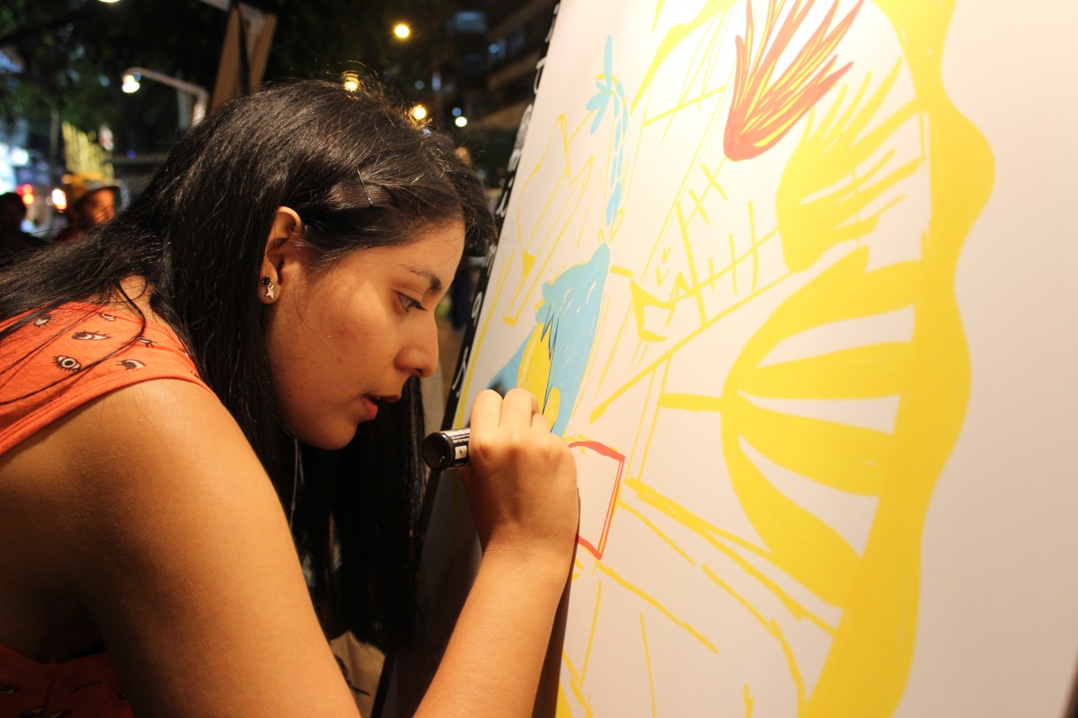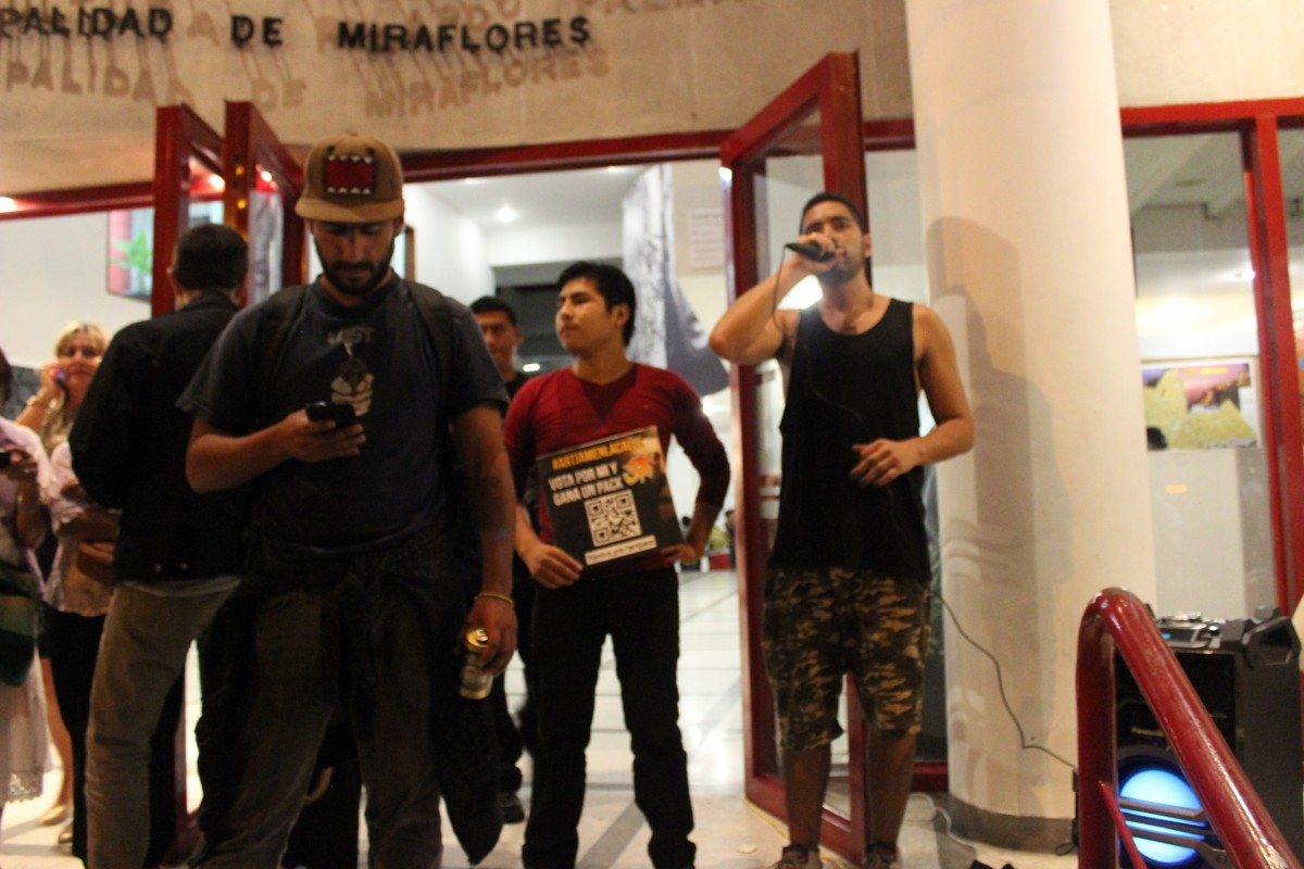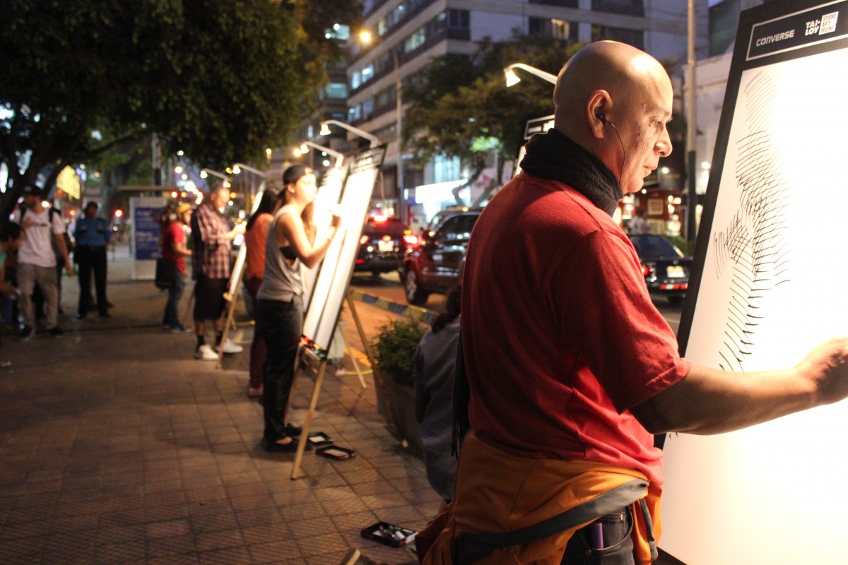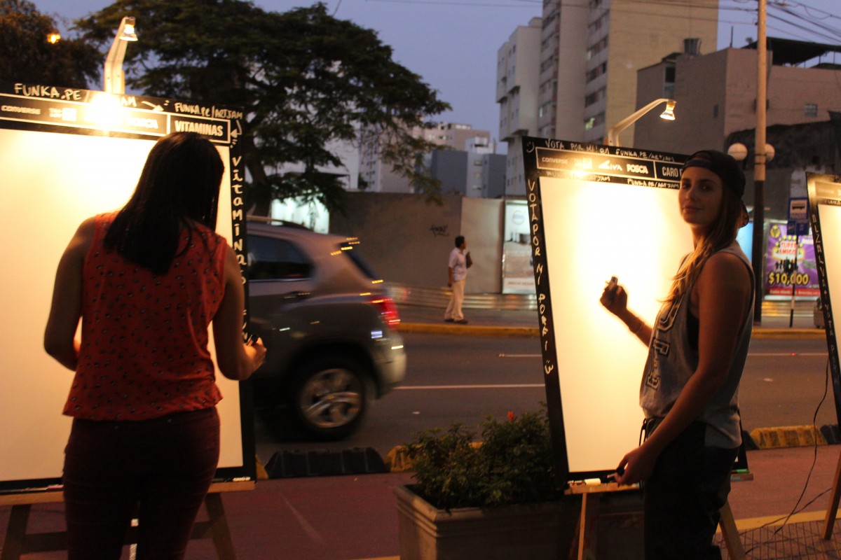 At 5 on Friday, Abril 17, onlookers watched as the sidewalk of outside of CC Ricardo Palma transformed into an art studio. Usually a private space, six urban artists invited all of Lima into their artistic processes. Of course, these urban artists are more accustomed to the street than your average painter, their canvases being construction walls late at night. Art Jam, however, put a spotlight on these stelth artists in order to celebrate them. Friends, family, art fiends, and curious foreigners all gathered around to watch the spectacle take place in front of them.