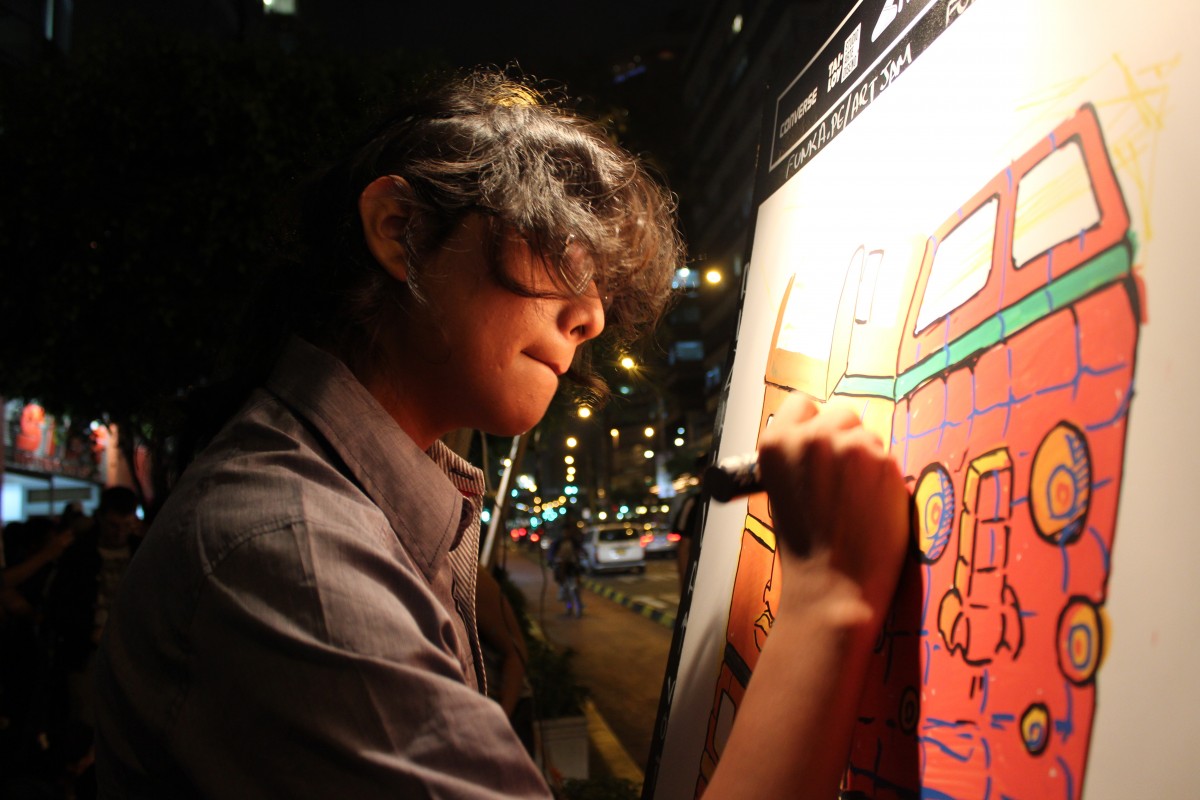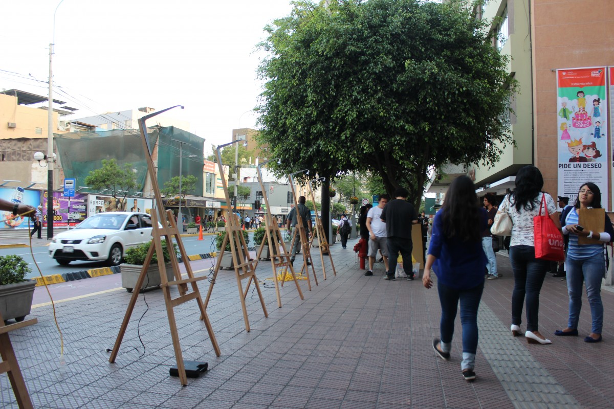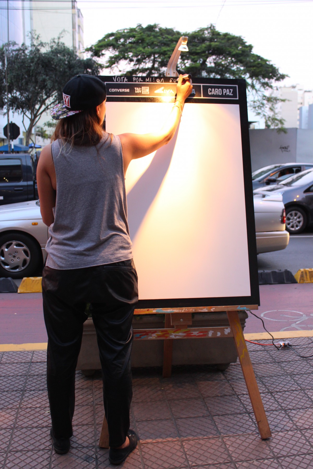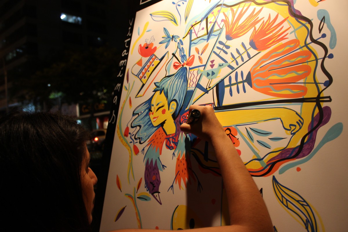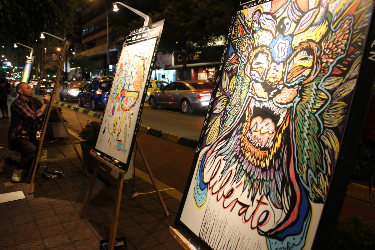 At 5 on Friday, Abril 17, onlookers watched as the sidewalk of outside of CC Ricardo Palma transformed into an art studio. Usually a private space, six urban artists invited all of Lima into their artistic processes. Of course, these urban artists are more accustomed to the street than your average painter, their canvases being construction walls late at night. Art Jam, however, put a spotlight on these stelth artists in order to celebrate them. Friends, family, art fiends, and curious foreigners all gathered around to watch the spectacle take place in front of them.