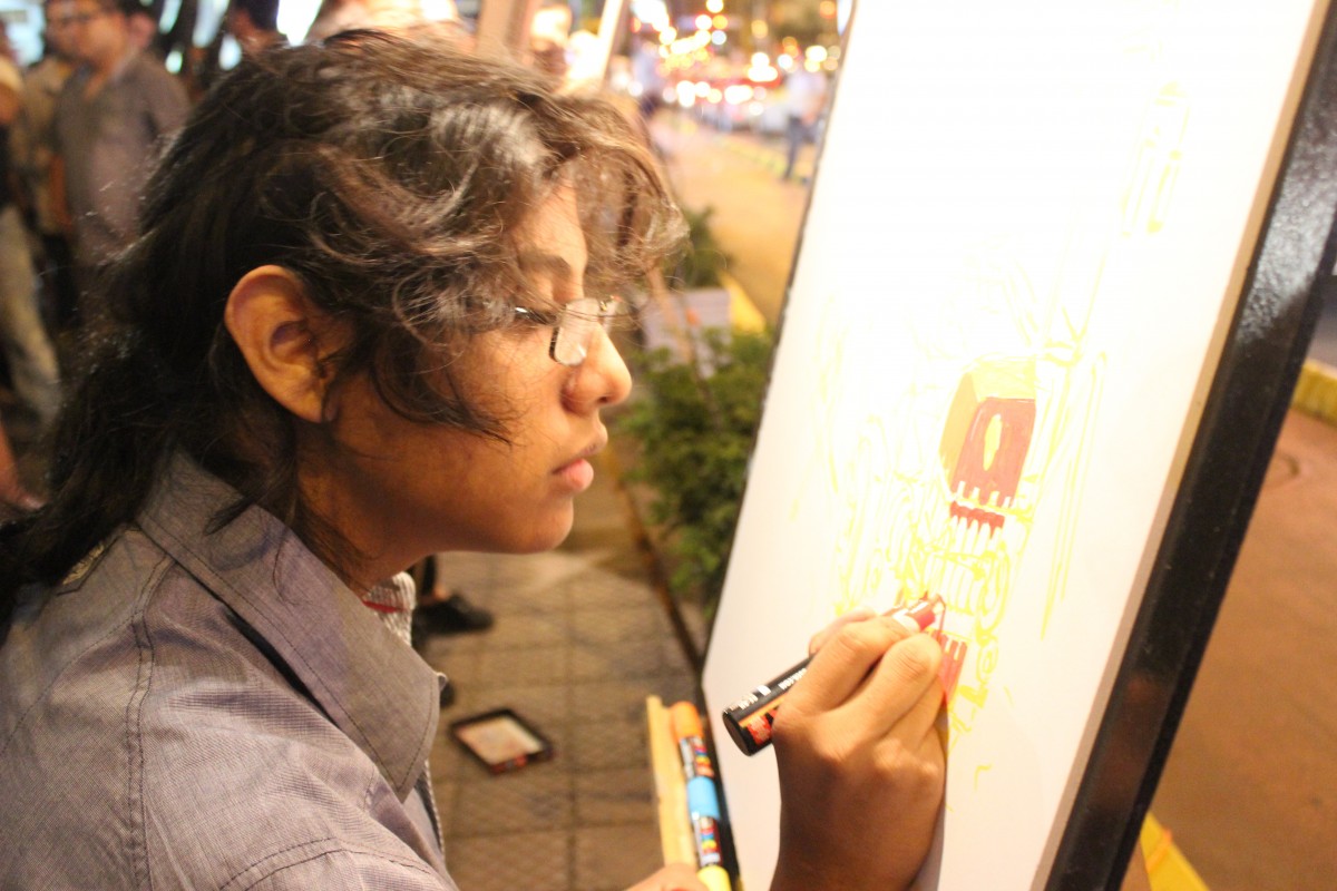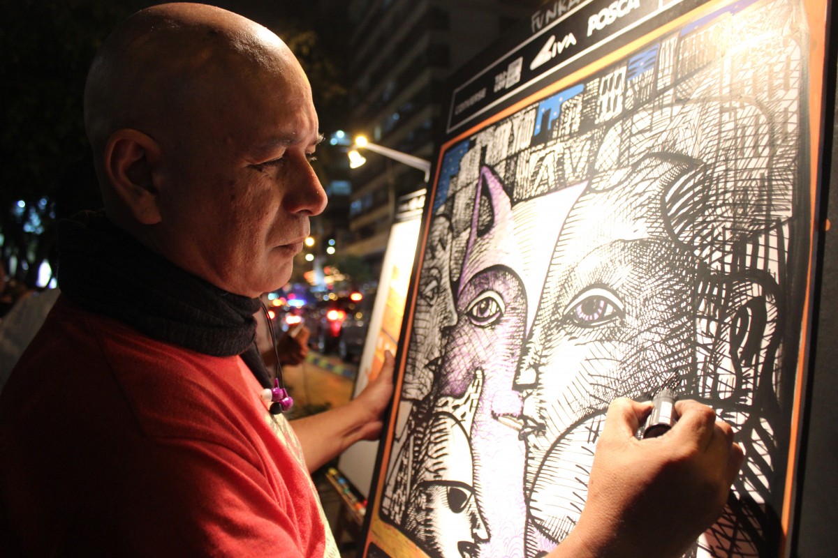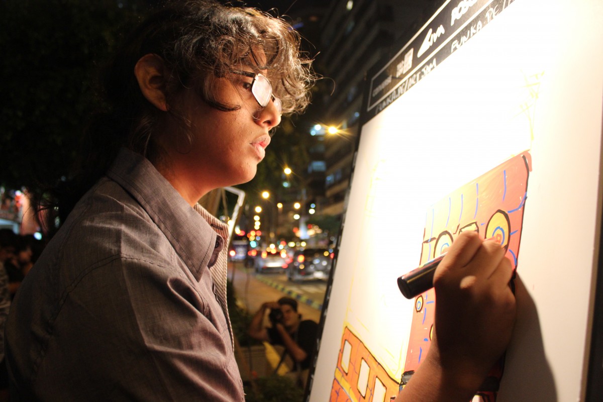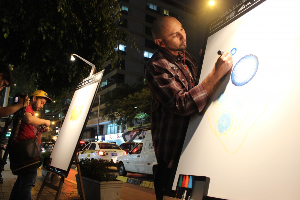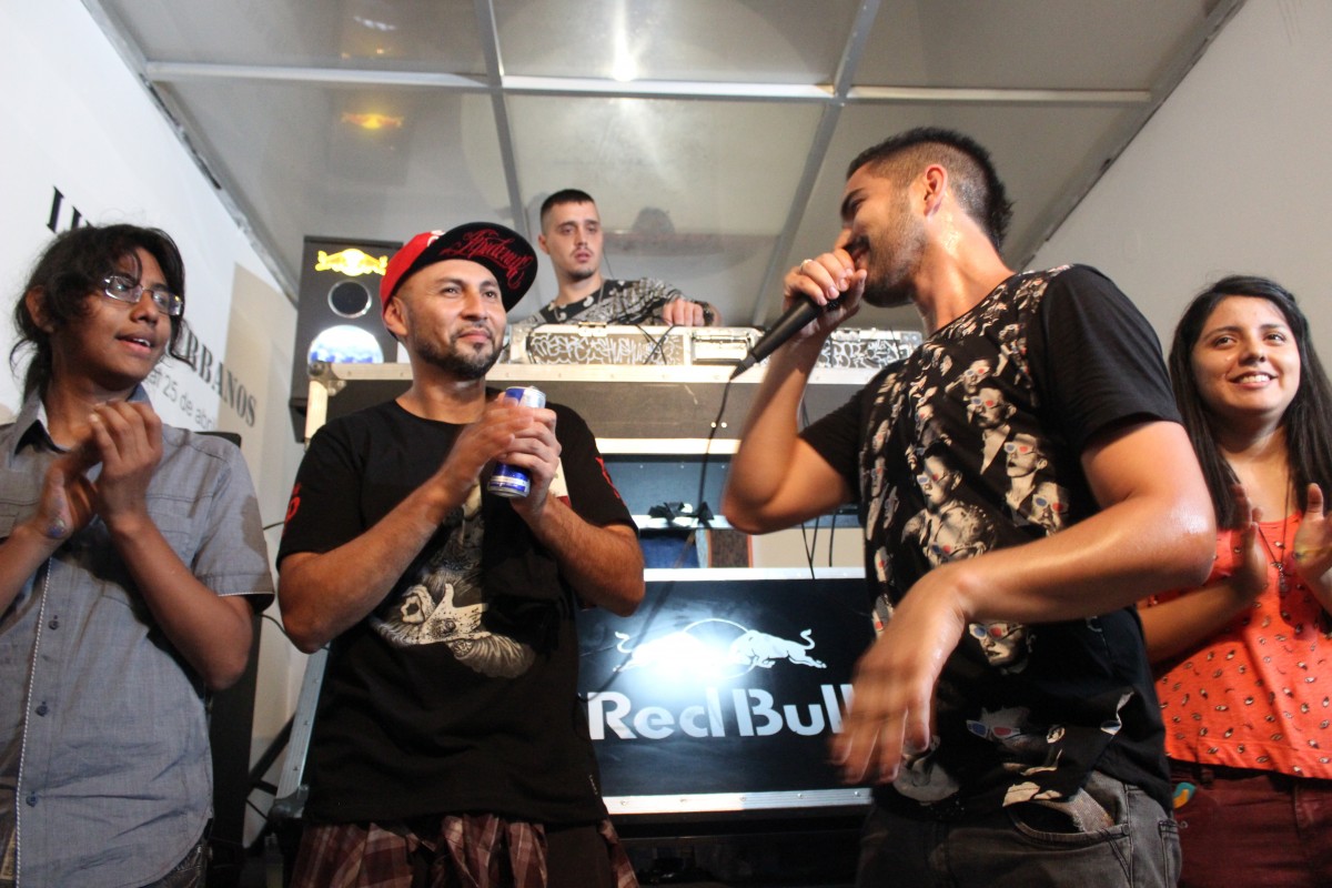 All of the artists had a distinct style and unique process that you could see in the first stroke. The artist known as Fog went to work of the tedious task of making concentrated dots. Two hours later, the guests were awed by the honest and intricate portrayal of a human heart with several narrow eyes breaking through a brick wall. Caro Paz, on the other hand, began her work like a race horse who knows the first leaps give you a starting advantage, making bold lines with a black marker to form a lion’s face and using the rest of the time to layer colors and intricate designs into the face. Then she took out her bold black marker to spell the word, “Libérate,” below the lion, as if the word was its roar. The only other girl in the competition was a young sweet looking girl who calls herself Vitaminas. She drew a whimsical fairy warrior girl attached to a bird. Lama, an older man than the rest, began his work by making black diagonal lines across the page and ended with an elaborate comic strip that told a beautiful story about a very sad woman. Other artists made an anthropomorphic double decker bus and a grinning hillbilly.