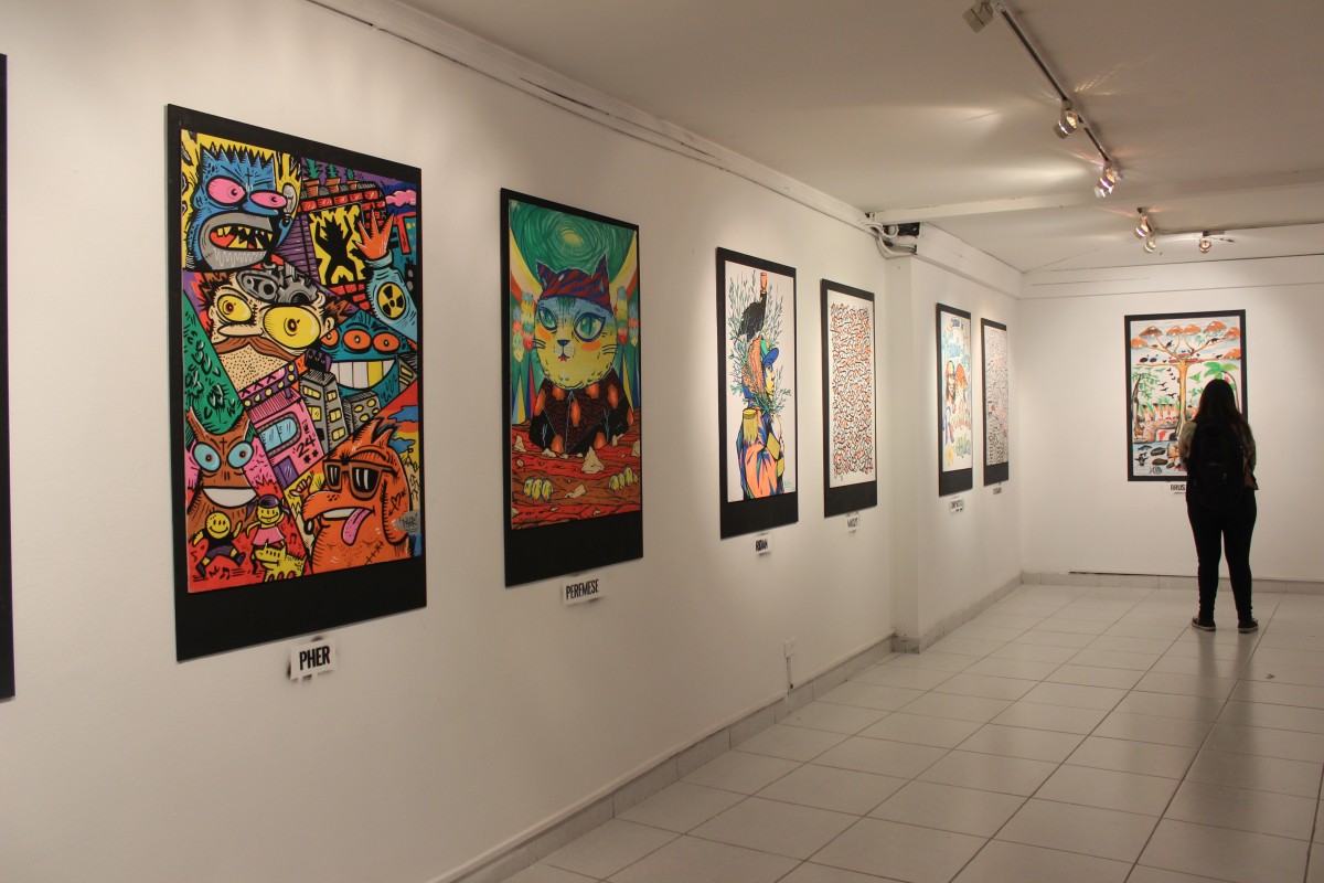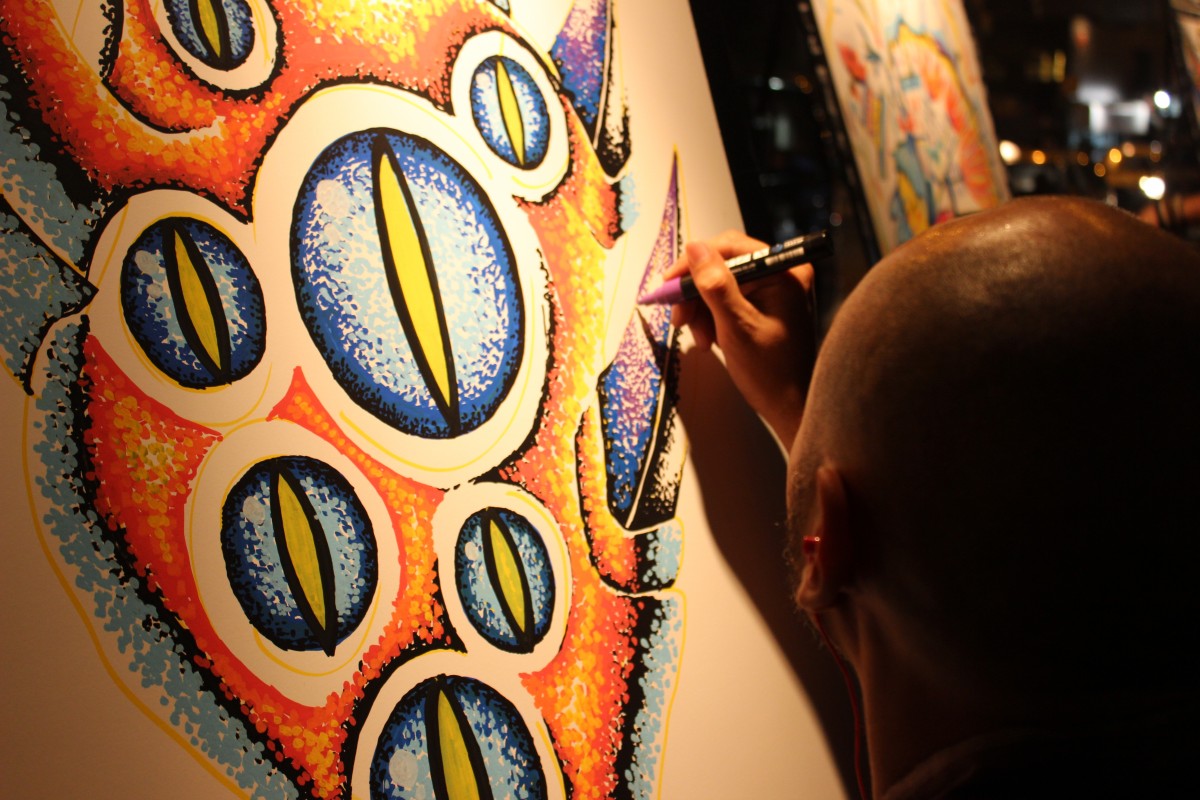 At around six, the art of setting up the canvases, lights and art supplies was over, and the artists were all given the same colored pens as they began their masterpiece. The artists had three hours to complete the task. They were to use their limited colored markers to make a masterpiece. In the corner of the canvas had an individualized bar code which you could scan on your smartphone to vote for your favorite. Once initial anticipation of the artists beginning their work, with the first scribbles on the canvas in one color, music began to blare from a speaker and free red bulls were handed out to the artists, as well as a few special guests. If one got bored of watching the artistic process, the basement of the cultural center was open to guests. The affiliated exhibition featured all the participants work from years past, which made the guests feel like they were becoming a part of history, the legacy that is Art Jam.
