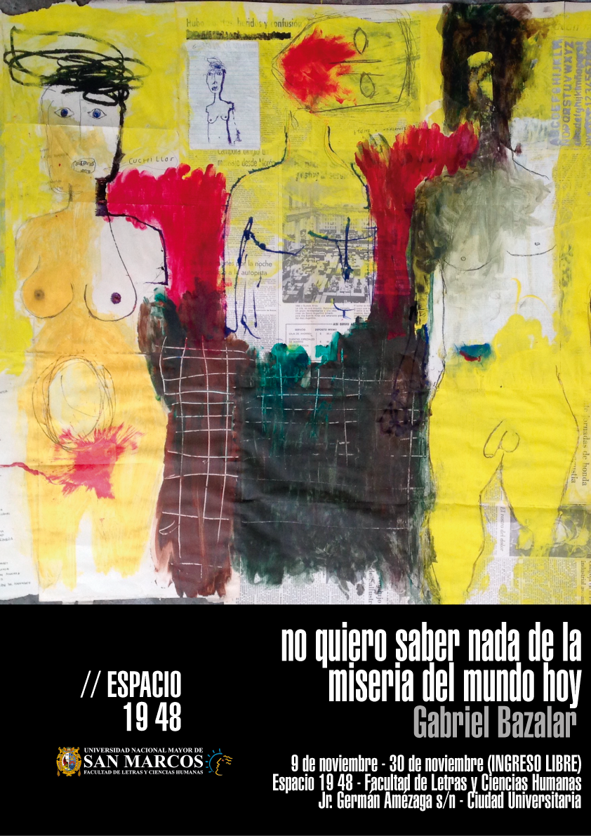 La galería Espacio 19 48 de la Facultad de Letras y Ciencias Humanas de la UNMSM presentará la exposición individual “no quiero saber nada de la miseria del mundo hoy” del artista plástico Gabriel Bazalar López, que se inaugurará el jueves 9 de noviembre a las 3:00 pm y podrá ser visitada hasta el jueves 30 de noviembre.
