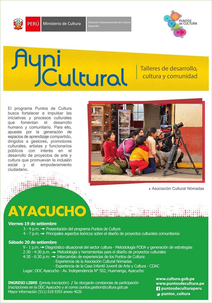 Los días viernes 19 y sábado 20 de setiembre, se realizarán los talleres de “Desarrollo, Cultura y Comunidad” en la ciudad de Ayacucho, de acuerdo al siguiente programa:
