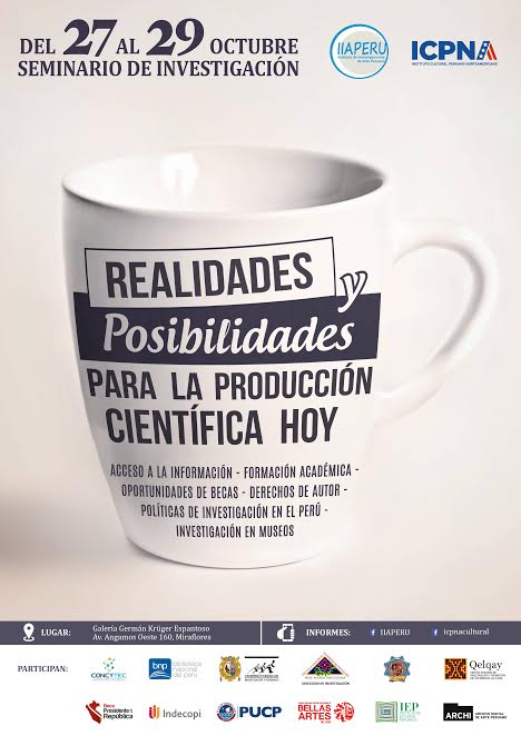 El Instituto de Investigaciones de Arte Peruano (IIAPERU) y el Instituto Cultural Peruano Norteamericano(ICPNA) organizarán el primer seminario de investigación: “Realidades y posibilidades para la producción científica hoy” que contará con la participación de más de 10 instituciones relacionadas con la investigación de nuestro patrimonio cultural peruano. Dicho evento se realizará del 27 al 29 de octubre en la Galería Germán Krüger Espantoso.