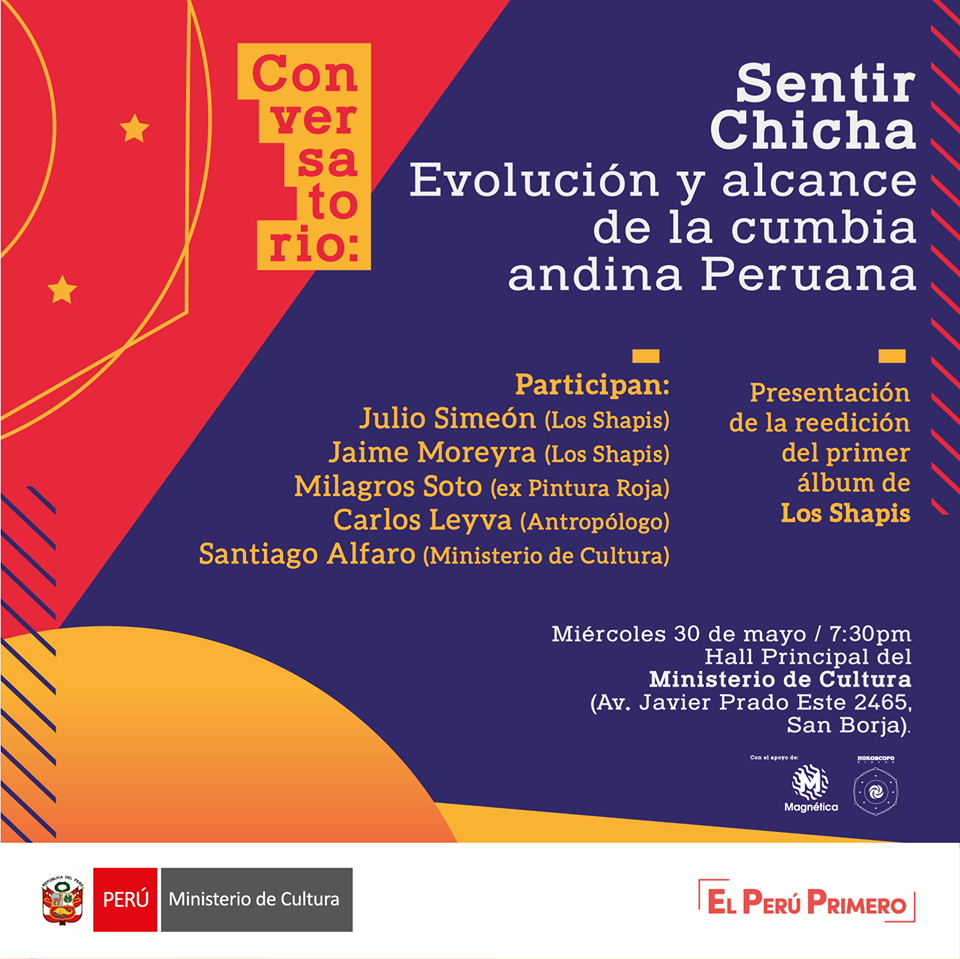 El Ministerio de Cultura del Perú presentará el miércoles 30 de mayo el conversatorio "Sentir Chicha: Evolución y alcance de la cumbia andina peruana". Se conversará acerca de las dinámicas de exhibición, circulación y difusión de la música Chicha a través del tiempo, desde los afiches y conciertos de barrio, hasta la presencia en plataformas digitales y su inclusión en catálogos como parte de la música del mundo.