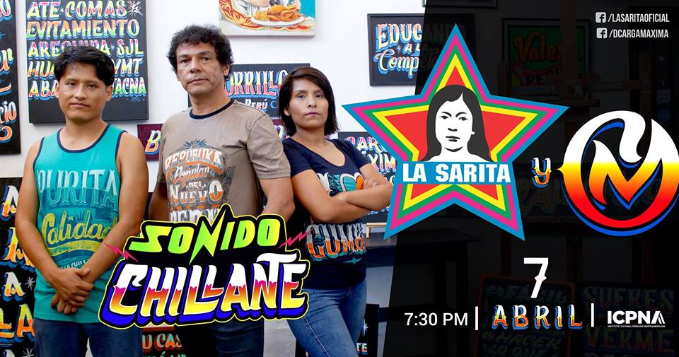 Propuesta que fusiona la música con el arte gráfico popular. La Sarita ofrecerá un concierto con sus mejores canciones donde el público podrá apreciar en vivo el proceso de la gráfica chillante a puro pulso y pincel de Carga Máxima.