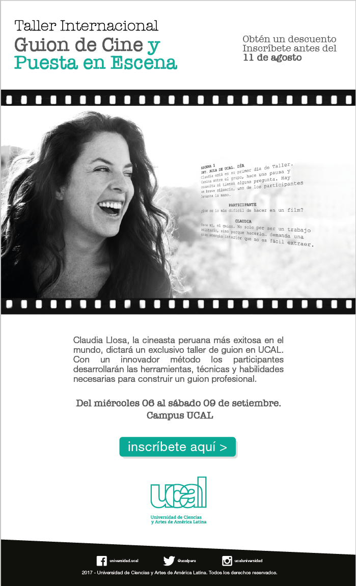 El Conversatorio Guión y Dirección de Cine, reúne a tres de los más importantes directores de cine peruanos en un solo escenario: el auditorio UCAL. Claudia Llosa, Augusto Tamayo y Eduardo Mendoza de Echave se juntan en un conversatorio único, para contar sus experiencias y servir de referentes para quienes realizan cine o desean iniciarse en él.