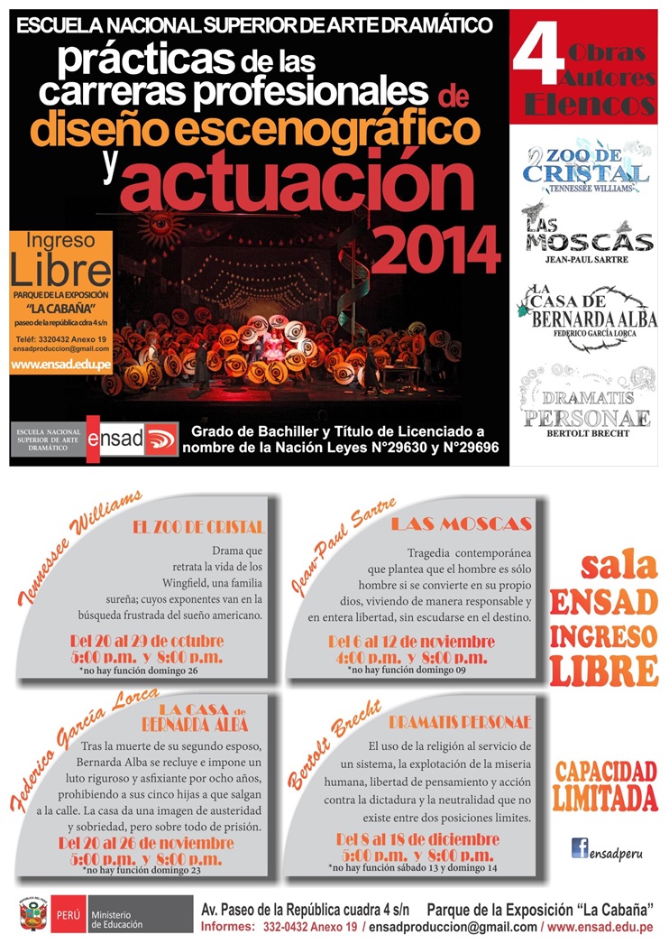 Del 20 de octubre al 18 de diciembre, "Temporadas teatrales de las prácticas pre-profesionales de las Carreras de Diseño Escenográfico y Actuación 2014.