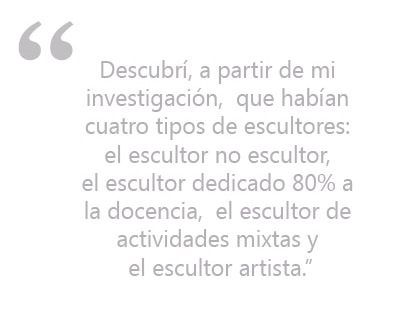 Lo interesante de todo esto es que mis datos arrojaban que del total de los egresados de escultura en la década de 1990, solamente una persona se dedicaba a la escultura al 100%. El dato sobre el artista docente era casi el 90% de los egresados. El artista, por lo tanto, tenía que ir alternando sus actividades como escultor con otras actividades que le generen un ingreso y pueda así subsistir. Esta situación ilustra lo difícil que puede ser para un artista el ingreso al mercado. Uno de los datos que siempre les doy a mis alumnos es que traten de hacer una gran carrera universitaria y terminar el último año con una obra contundente, ya sea a nivel de la idea, la forma o la técnica, para que eso pueda ser tu mejor carta de presentación. Además, terminar en los primeros lugares, ganar concursos y entrar a las mejores galerías del medio. Ahora, dentro del arte, no hay un manual del éxito. Si lo tuviéramos haríamos un arte muy comercial o un arte que no tiene ningún tipo de repercusión para la gente que está ávida de consumir arte, de comunicarse a través del arte, de sentir y de percibir. Tengo amigos muy cercanos que les cuesta mucho exponer en una galería. Los casos son muy diferentes, muy particulares. Cada uno va a tener una versión diferente de cómo ve y percibe el mercado, su ingreso a él también.