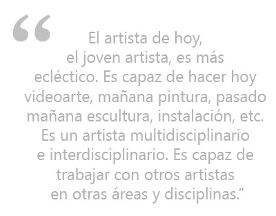 El artista de hoy trabaja varios lenguajes a la vez, en cambio el artista de las décadas de los 70, 80, 90 era un artista con un lenguaje muy propio, muy particular, que muy difícilmente cambiaba de forma o de estilo. El artista de hoy, el joven artista, es más ecléctico. Es capaz de hacer hoy videoarte, mañana pintura, pasado mañana escultura, instalación, etc. Es un artista multidisciplinario e interdisciplinario. Es capaz de trabajar con otros artistas en otras áreas y disciplinas. Yo soy un artista con una formación tradicional que trata de desenvolverse como un artista contemporáneo. Un artista que tuvo una formación más “rígida”, como un escultor académico, pero al cual el mundo actual ha exigido y ha invitado a trabajar de manera más contemporánea. Ello en el sentido de que me gusta ser un poquito más libre, de repente hago xilografía, grabado, mañana hago una escultura con cierta materialidad y pasado mañana hago un trabajo en la pared con otra materialidad, en otro contexto, que me de nuevas percepciones, ideas y significados. Ese juego técnico y de ideas tiene que ser libre, dinámico, no puede ser estático en estos momentos.