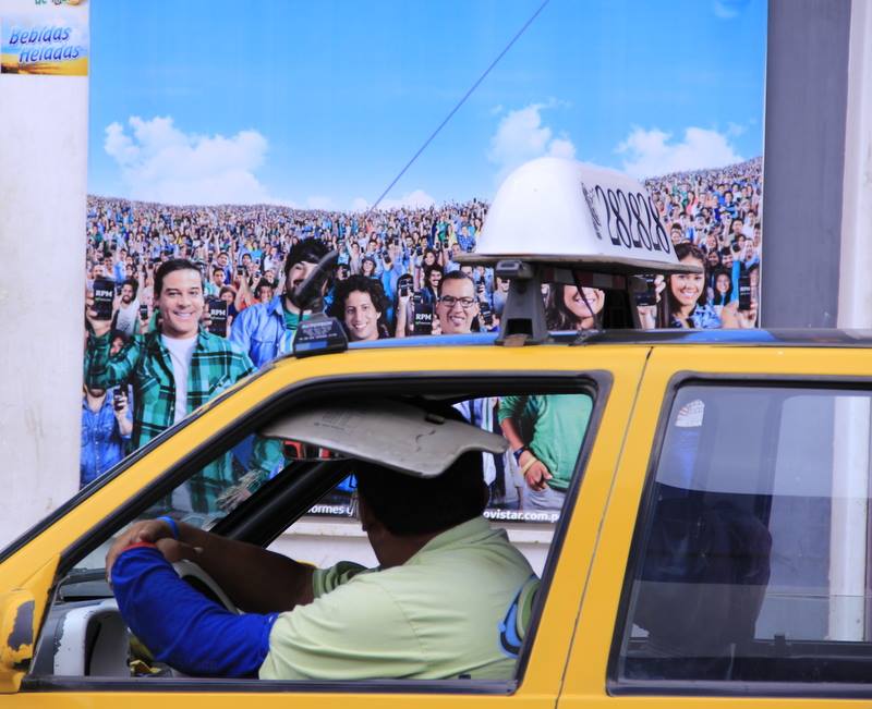 foto4.fotografiando los sueños(015) plaza de armas de trujillo/la sombra de un fotógrafo y un taxista durmiendo/un taxista se quedó dormido en su carro y un fotógrafo se acerca a retratarlo/ivan orbegoso cipra | | foto5.los mundos chocan,las culturas también(2015)plaza de armas de trujillo/una familia y un cartel publicitario/una familia oriunda pasa observando un cartel publicitario donde se lee que los mundos chocan/ivan orbegoso cipra | |