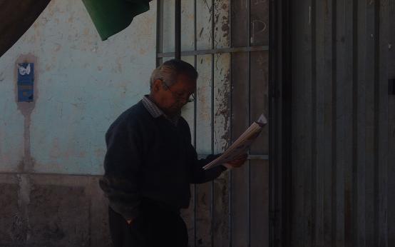 Foto 4: Un señor leyendo el periódico. (2014). A pocas pasos del parque Maria Parado de Bellido /Fotógrafo Karen. Reseña: Esta foto muestra como el ciudadano se informa en plena calle leyendo el periódico, sin importar el ruido, nada de nada, se apoya en las rejas de un local.