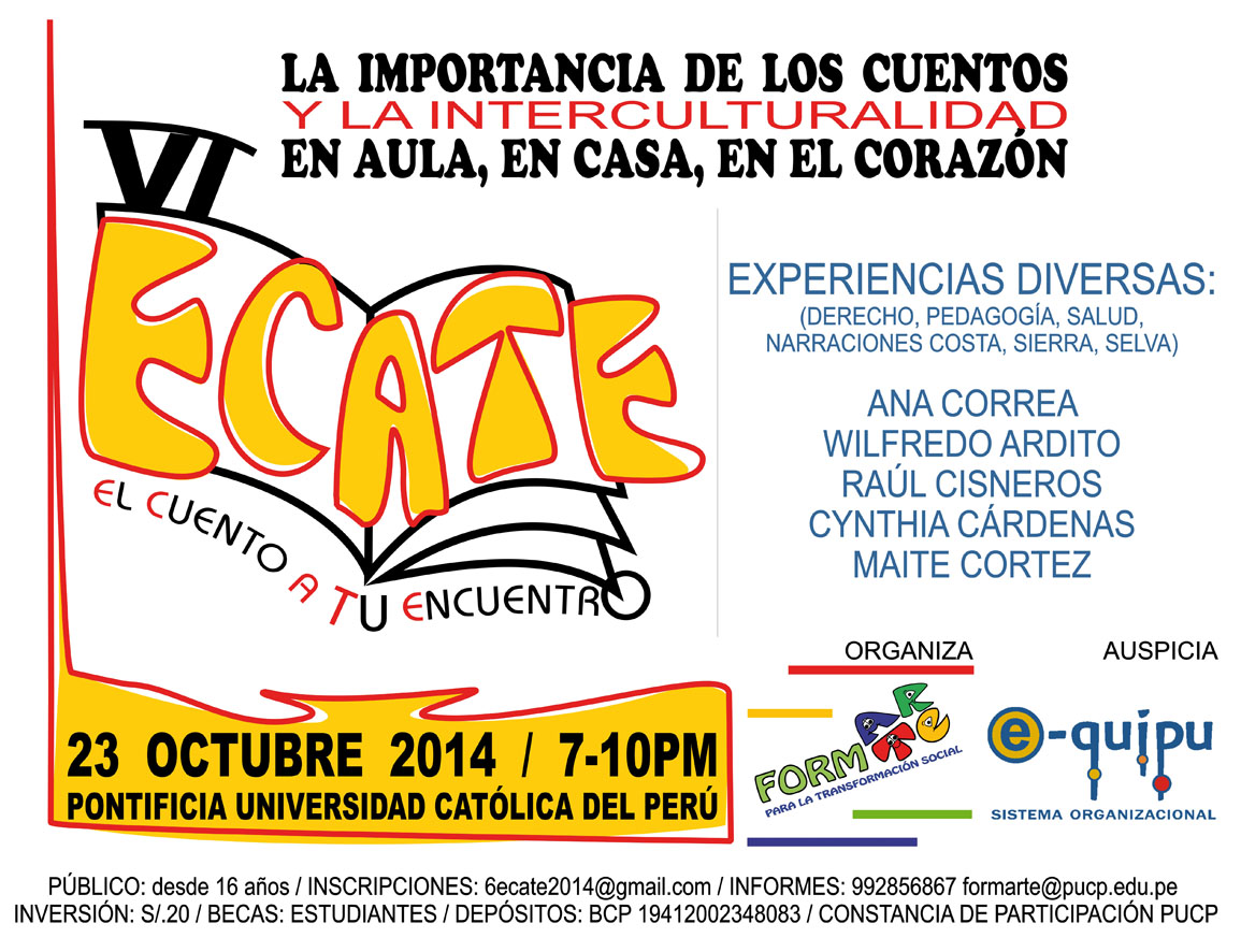 "La importancia de los cuentos y la interculturalidad en aula, en casa, en el corazón" es el emblema del IV ECATE que se realizará el 23 de octubre 2014 desde las 7  a 10 de la noche en la PUCP. En esta oportunidad se buscará abordar el tema desde el derecho, la pedagogía y la salud a través de las narraciones de la costa, sierra y selva. Las narraciones estarán a cargo de Ana Correa, Wilfredo Ardito, Raúl Cisneros, Cynthia Cárdenas y Maite Cortez.