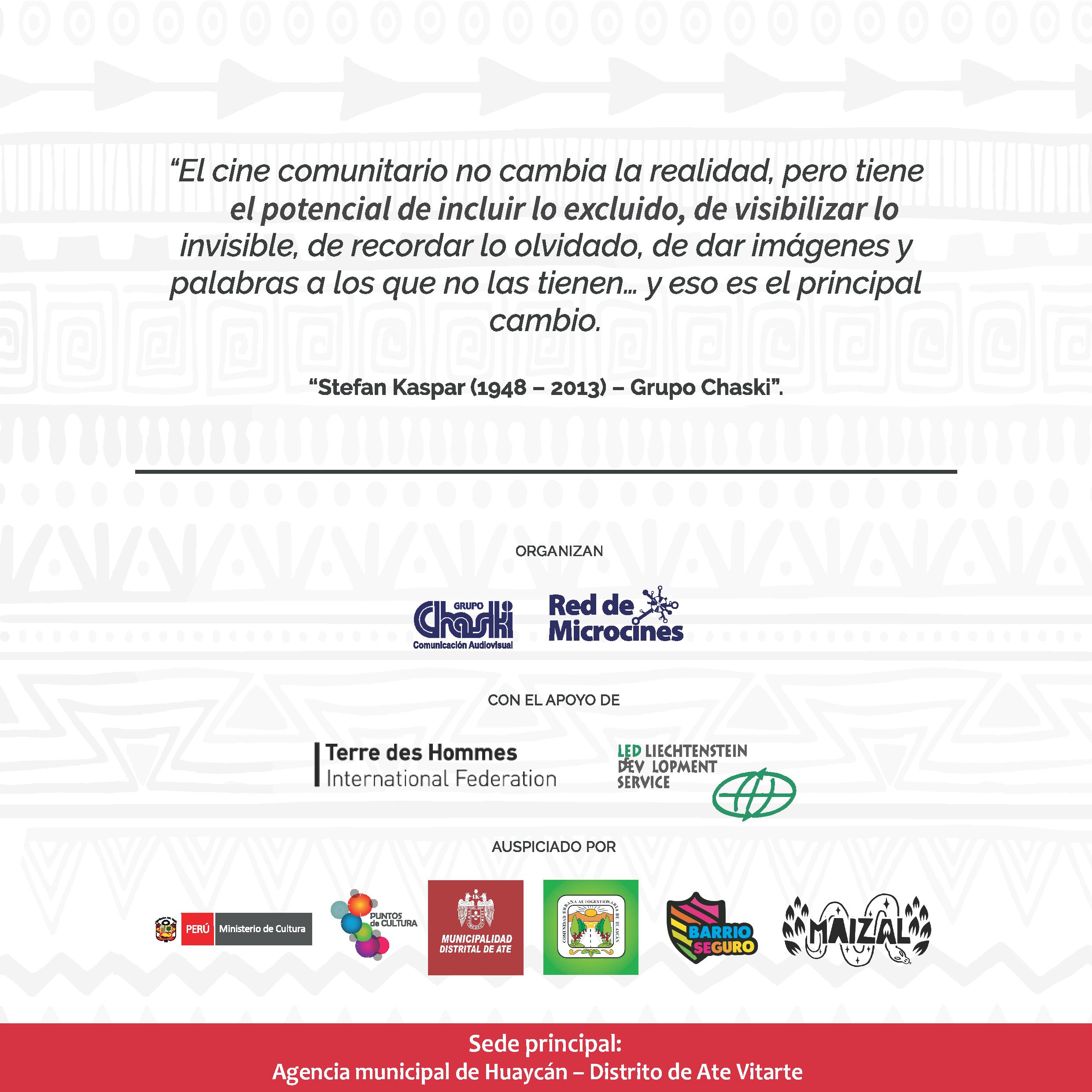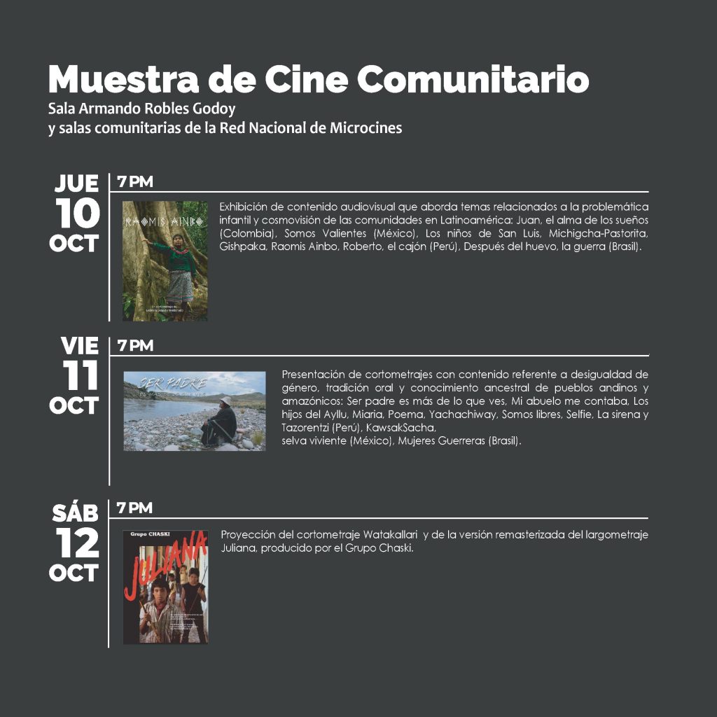 Asimismo la muestra de cine comunitario se proyectará en las 32 salas comunitarias de la Red de Microcines Chaski y en el auditorio Armando Robles Godoy del Ministerio de Cultura.