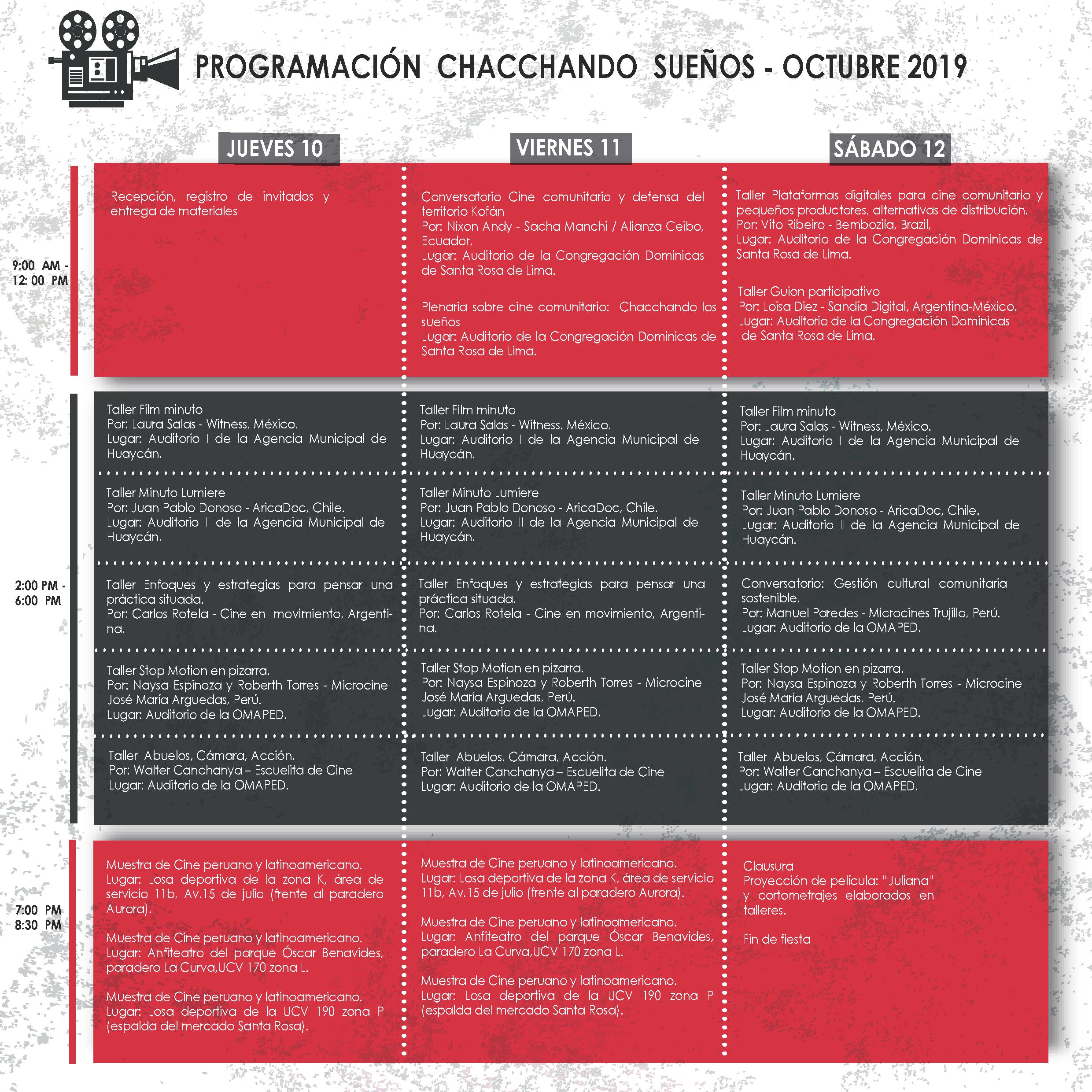Este año, en coordinación con miembros de la Red de Microcines de Lima, creímos conveniente trasladar el Chacchando Sueños de la ciudad a la comunidad; es así que este año tendrá como sede principal, los auditorios de la agencia municipal y las plazas públicas de las zonas K, L y P de Huaycán, en Ate Vitarte.